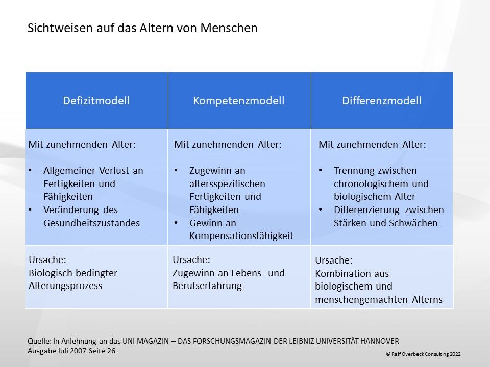 Aus heutiger Sicht ist es wesentlich sinnvoller den Fokus auf die Stärken der älteren Menschen zu richten. Dies hat die Abkehr vom sogenannten "Defitzitmodell" hin zum "Kompetenzmodell", beziehungsweise "Differenzmodell" zur Folge.