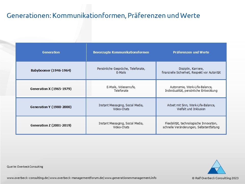 Die nachfolgende Übersicht gibt Hinwiese zu möglichen Gemeinsamkeiten und Differenzen der unterschiedlichen Generationen und ihren Kommunikationsformen, Präferenzen und Werten.